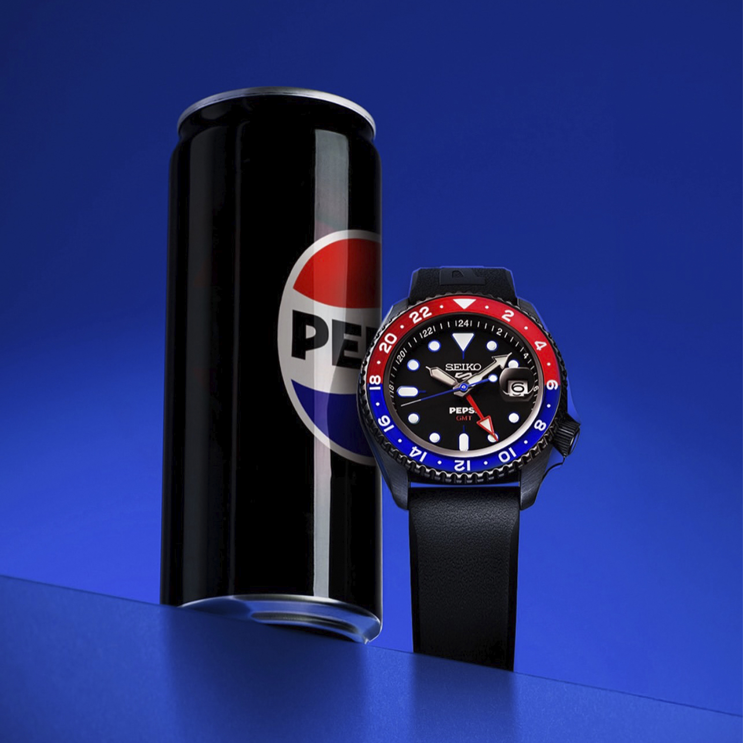 Старшая модель крупнее — 42,5 мм — и получила чёрное PVD-покрытие корпуса, придающее ей более агрессивный характер. Главное отличие — функция GMT на базе калибра 4R34: красная 24-часовая стрелка позволяет отслеживать второй часовой пояс. Двунаправленный безель разделён ровно пополам на красную и синюю зоны. Вместо браслета — чёрный силиконовый ремешок с тиснёным логотипом Pepsi, впервые применённый в линейке SKX GMT. Прозрачная задняя крышка демонстрирует механизм и серийный номер лимитки.
