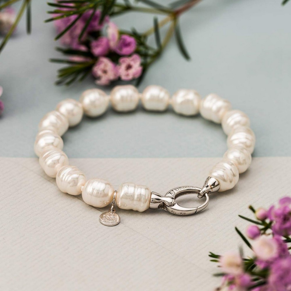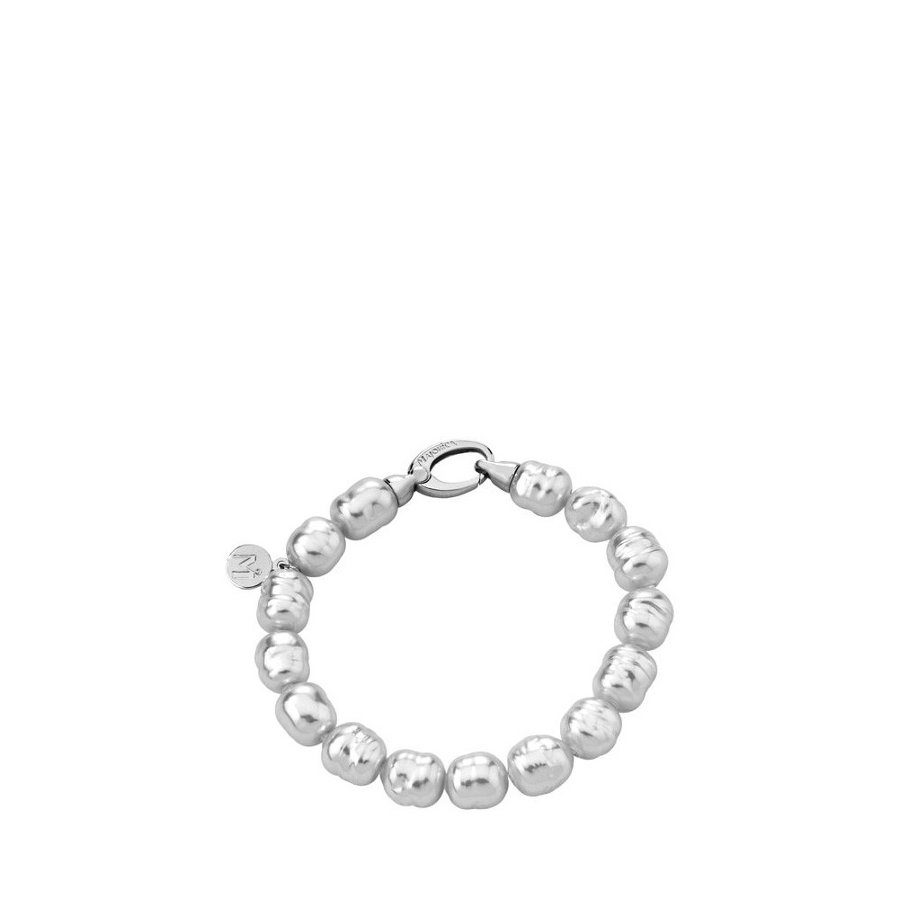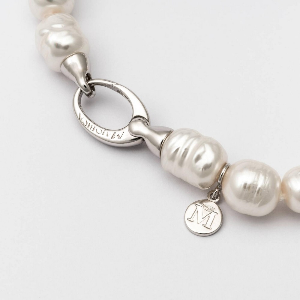 Браслет, серебро 925 пробы с гальваническим покрытием родием со вставками из органического жемчуга формы барокко белого цвета диаметром 8 мм, длина 19 см.