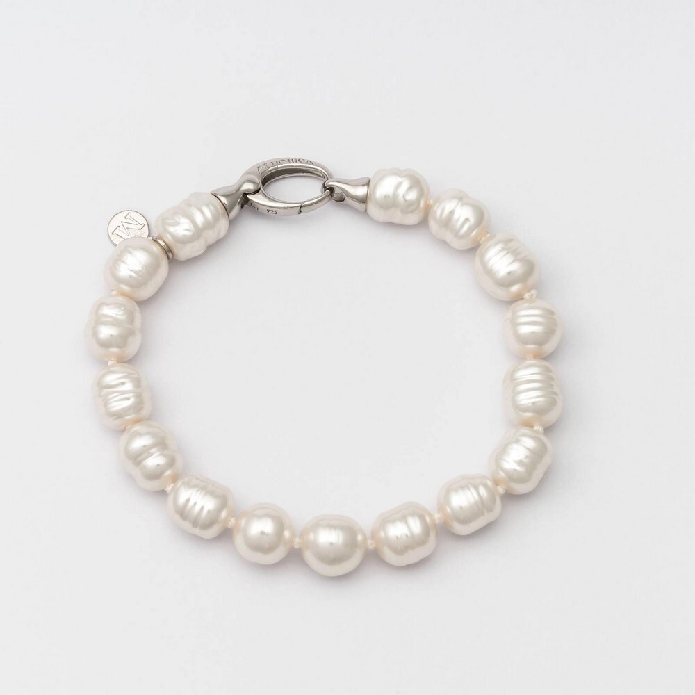 Браслет, серебро 925 пробы с гальваническим покрытием родием со вставками из органического жемчуга формы барокко белого цвета диаметром 8 мм, длина 19 см.