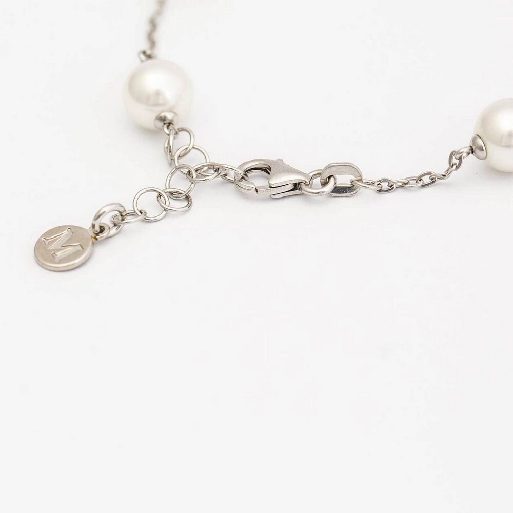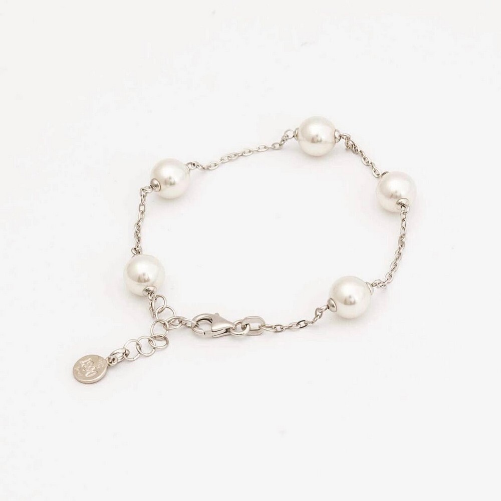 Браслет, серебро 925 пробы с гальваническим покрытием родием со вставками из органического жемчуга круглой формы белого цвета диаметром 8 мм, длина 15,5/18,5 см.