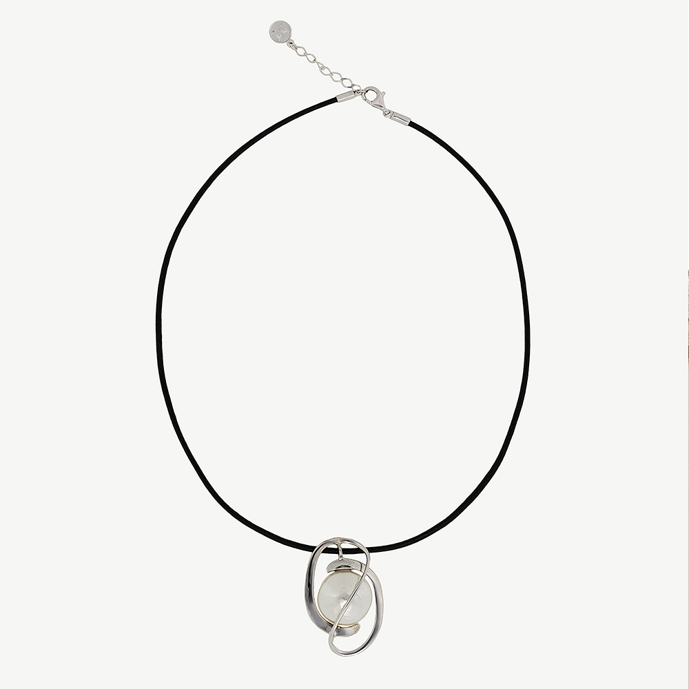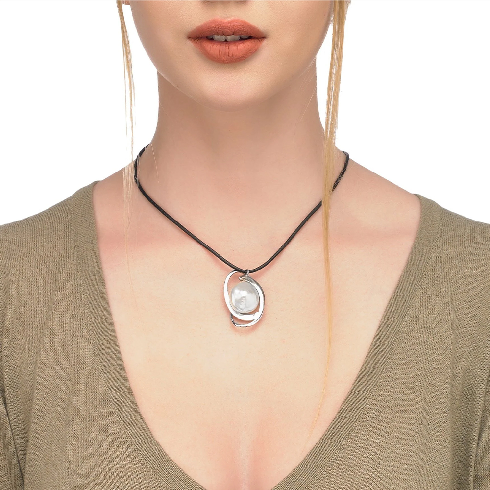 Кулон на черном кожаном шнурке, длина 42/47 см, серебро 925 пробы, покрытие родием, жемчуг белый круглый плоский 18 мм