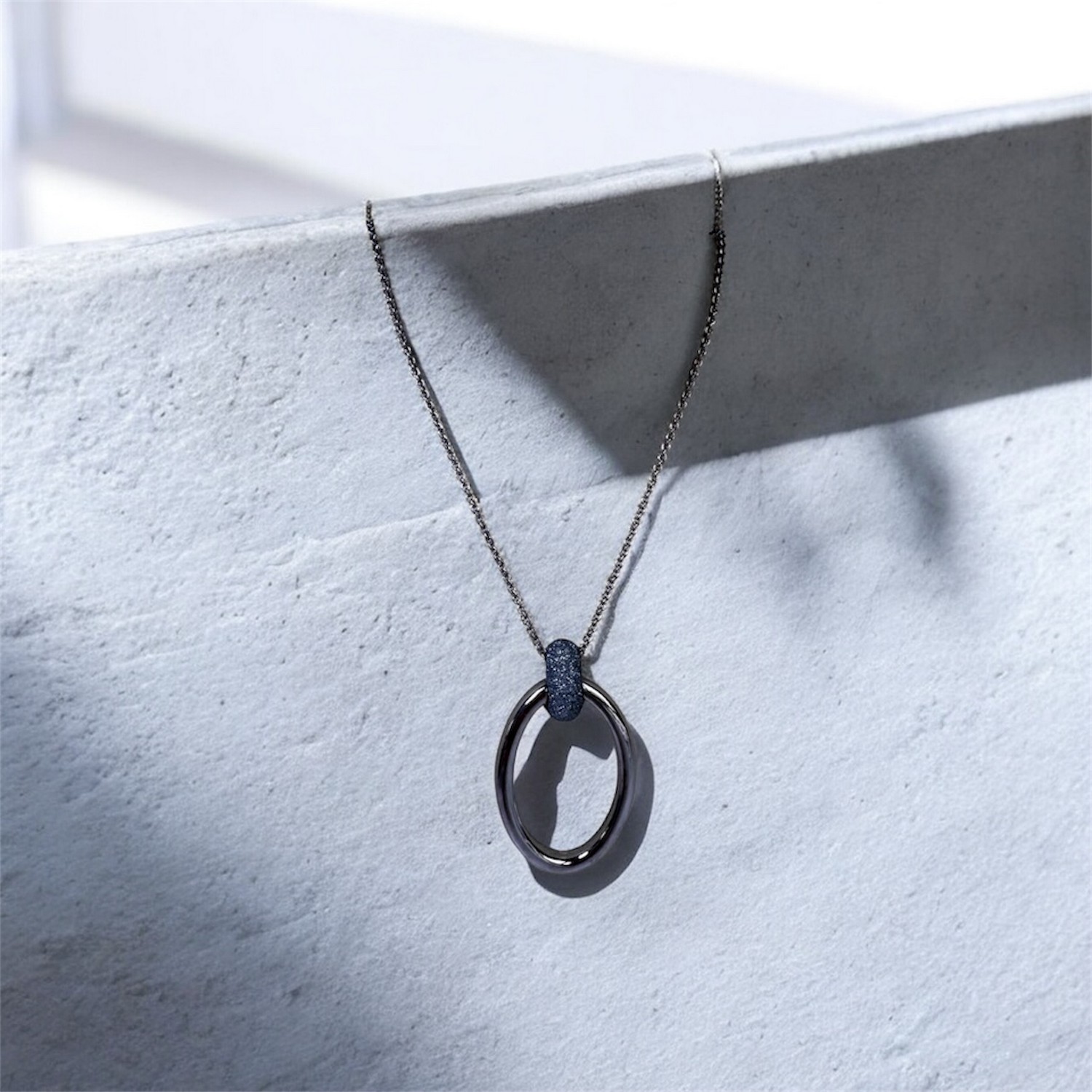 Колье из коллекции Polvere di Sogni выполнено из серебра покрытого черным рутением и эмалью из микрочастиц, полученными с помощью нанотехнологий из натуральных минеральных материалов. Застежка - карабин. Длина цепочки 76 см.