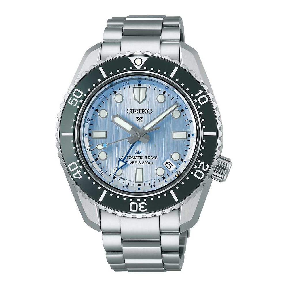 Дайверские GMT-часы Seiko Prospex SPB385J1 из лимитированной серии Save the Ocean Arctic — всего 4,000 экземпляров — оснащены японским автоматическим калибром 6R54 на 24 камнях — первым GMT-механизмом Seiko для дайвинга. Запас хода 72 часа на одном заводе — максимум среди Seiko. Частота баланса 21,600 полуколебаний в час. Механизм с возможностью ручного завода и функцией остановки секундной стрелки. Точность хода +25/-15 секунд в сутки. Защита от магнитных полей до 4,800 A/м. Корпус из нержавеющей стали диаметром 42 мм, высотой 48,6 мм и толщиной 12,9 мм. Вес 176 г. Голубой циферблат с текстурой арктических ледников украшен индексами в виде точек и штрихов с люминесцентным составом LumiBrite. Центральная 24-часовая GMT-стрелка устанавливается независимо с шагом в 1 час. Апертура даты между отметками 4 и 5 часов. Рифленый однонаправленный вращающийся безель с керамической вставкой для работы в перчатках. Сапфировое стекло с антибликовым покрытием. Завинчивающаяся заводная головка в положении 4 часа и завинчивающаяся задняя крышка с индивидуальным серийным номером (от 0001 до 4000). Стальной браслет шириной 20 мм с раскладывающейся застежкой с системой блокировки. Водостойкость WR 200 (20 атмосфер) по стандарту ISO. Гарантия 2 года.