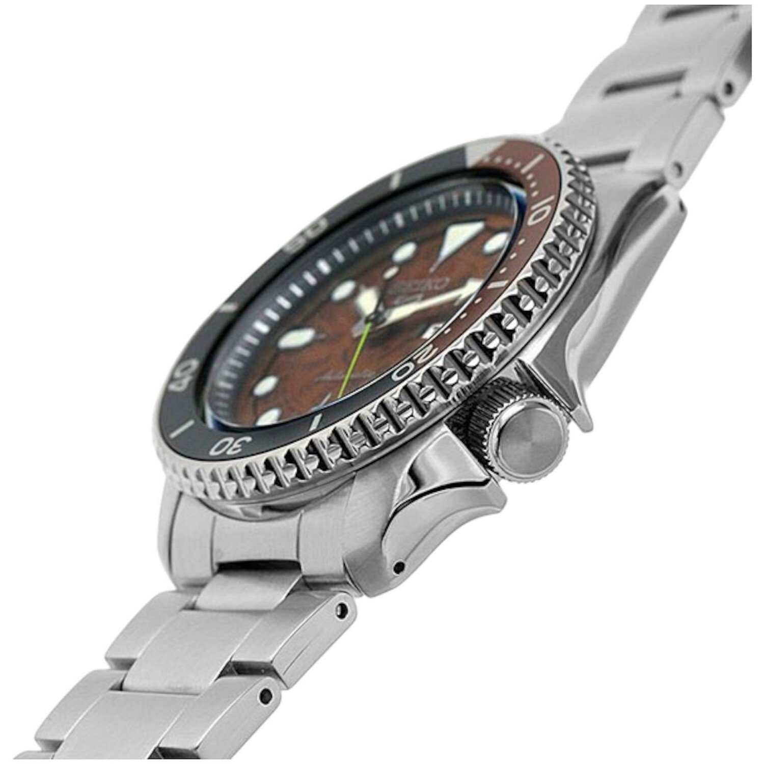 Спортивная коллекция Seiko 5. Отдавая дань уважения культовому “Сонару времени” 1970-х годов от Seiko, эти модель оснащена характерным полупрозрачным оранжевым циферблатом, на котором виден диск с датой дня. Двухцветный однонаправленно вращающийся безель, циферблат украшен яркими светящимися стрелками и метками, а также контрастной секундной стрелкой. Часы оснащены автоматической технологией, которой вы управляете при каждом движении, и механизмом с 24 камнями, который совершает 21 600 колебаний в час, с запасом хода около 41 часа и возможностью ручного подзавода. Часы изготовлены из нержавеющей стали с фиксирующей трехстворчатой застежкой-кнопкой. Водонепроницаемость 100 м