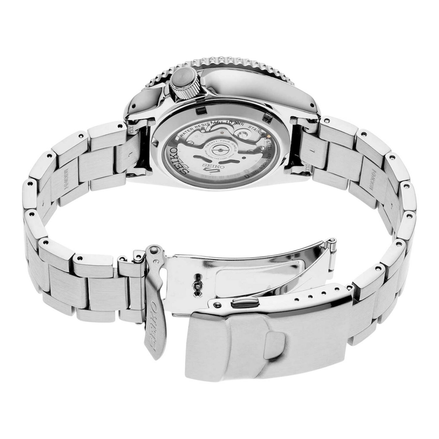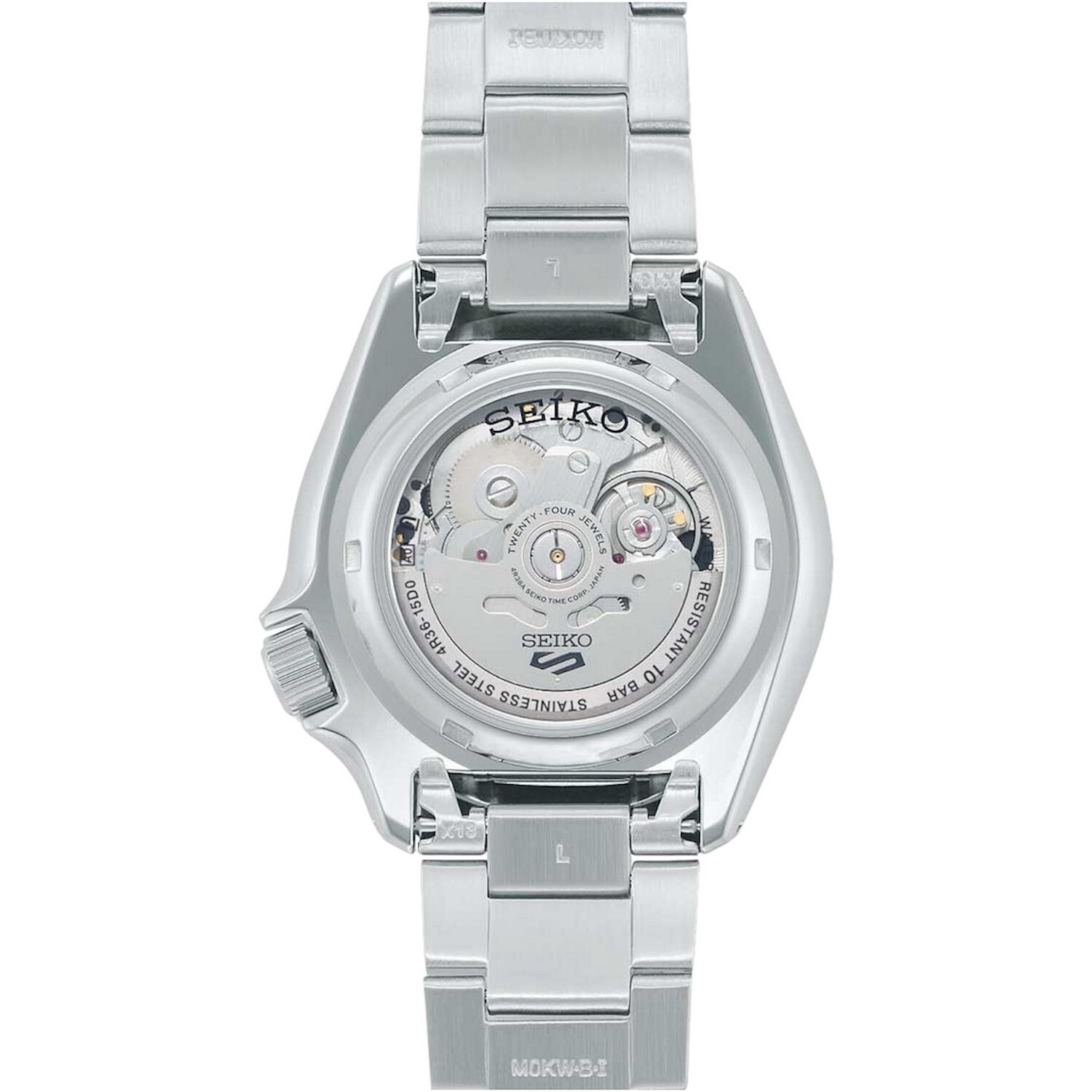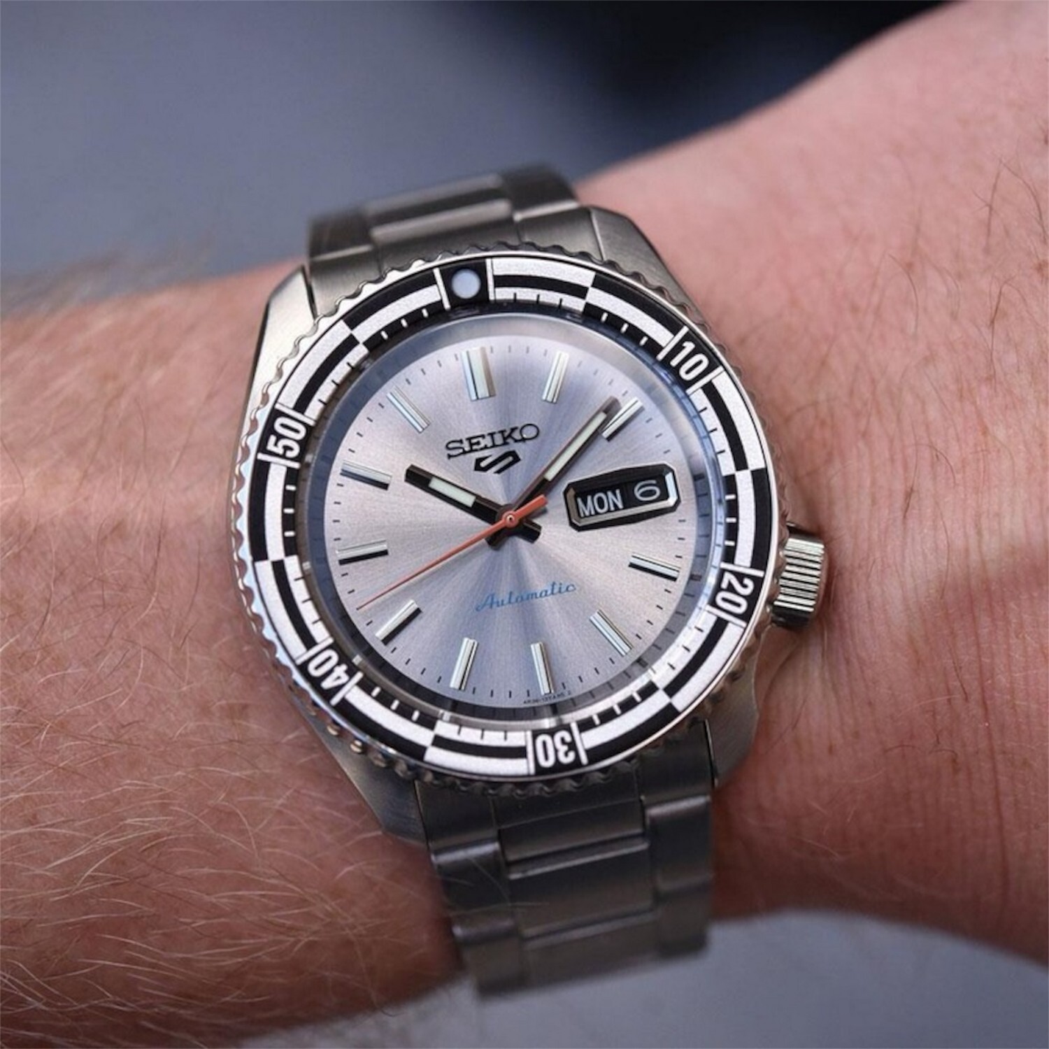 Специальное спортивное издание Seiko 5. Вдохновленные популярной моделью 5126-8130 конца 60-х, эти часы предлагают современный дизайн в винтажном стиле, благодаря обновленному корпусу и обтекаемому циферблату, сохраняя при этом серебристо-черную цветовую гамму оригинала. Серебристый циферблат, обрамленный черно-серебристым однонаправленно вращающимся безелем, оснащен календарем дня / даты, красно-оранжевой секундной стрелкой, а также светящимися стрелками и маркерами. Механизм с 24 камнями, видимый через прозрачную заднюю крышку, оснащен автоматической технологией, позволяющей управлять каждым движением, и работает с частотой 21 600 колебаний в час при запасе хода около 41 часа и возможности ручного подзавода. Часы изготовлены из нержавеющей стали с фиксирующей трехстворчатой застежкой-кнопкой. Водонепроницаемость 100 м