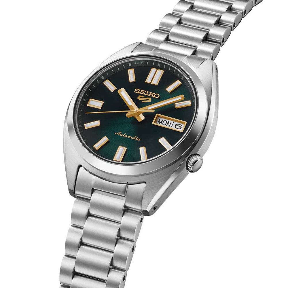 Зелёный циферблат в корпусе 37,4 мм на стальном браслете — компактная «пятёрка» с актуальным цветом для мужчин, ценящих аккуратную посадку. Миниатюрный размер прячется под манжетой и подходит любому запястью.