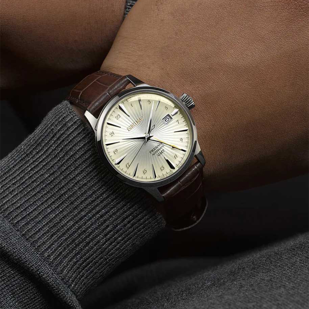Изысканный подарок на юбилей, годовщину или мужчине, ценящему классический стиль. Купить Seiko SSK041 — выбрать Presage GMT с бежевым циферблатом, коричневым кожаным ремешком и калибром 4R34.