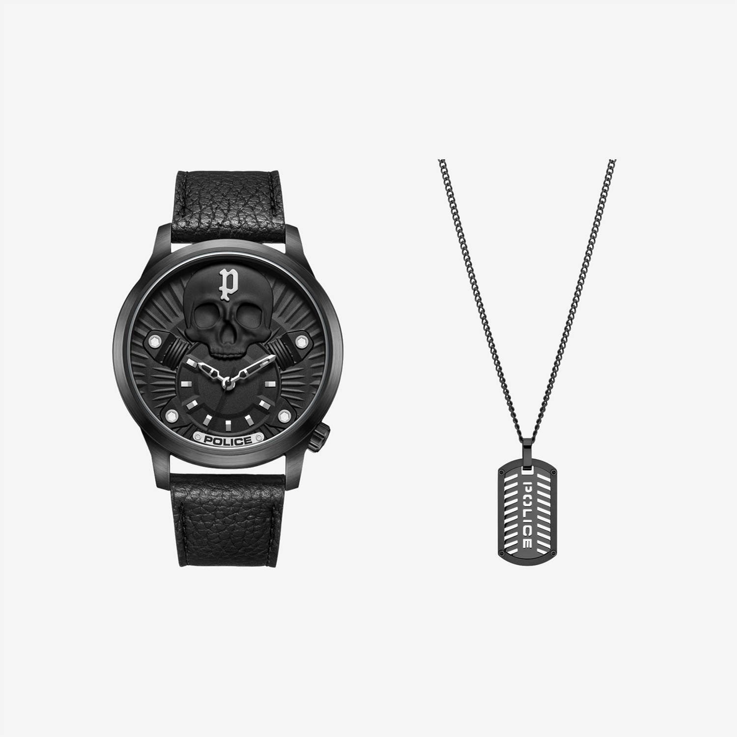 Подарочный комплект состоит из мужских мужских часов и кулона с цепочкой Police. Идеальное комбо для стильного мужского образа и подарка. Часы: минеральное стекло, корпус из нержавеющей стали 44 мм, кварцевый механизм, ремешок из натуральной кожи. Кулон: нержавеющая сталь, длина цепи 70 см, кулон 4,5 х 2,5 см. Гарантия 2 года.
