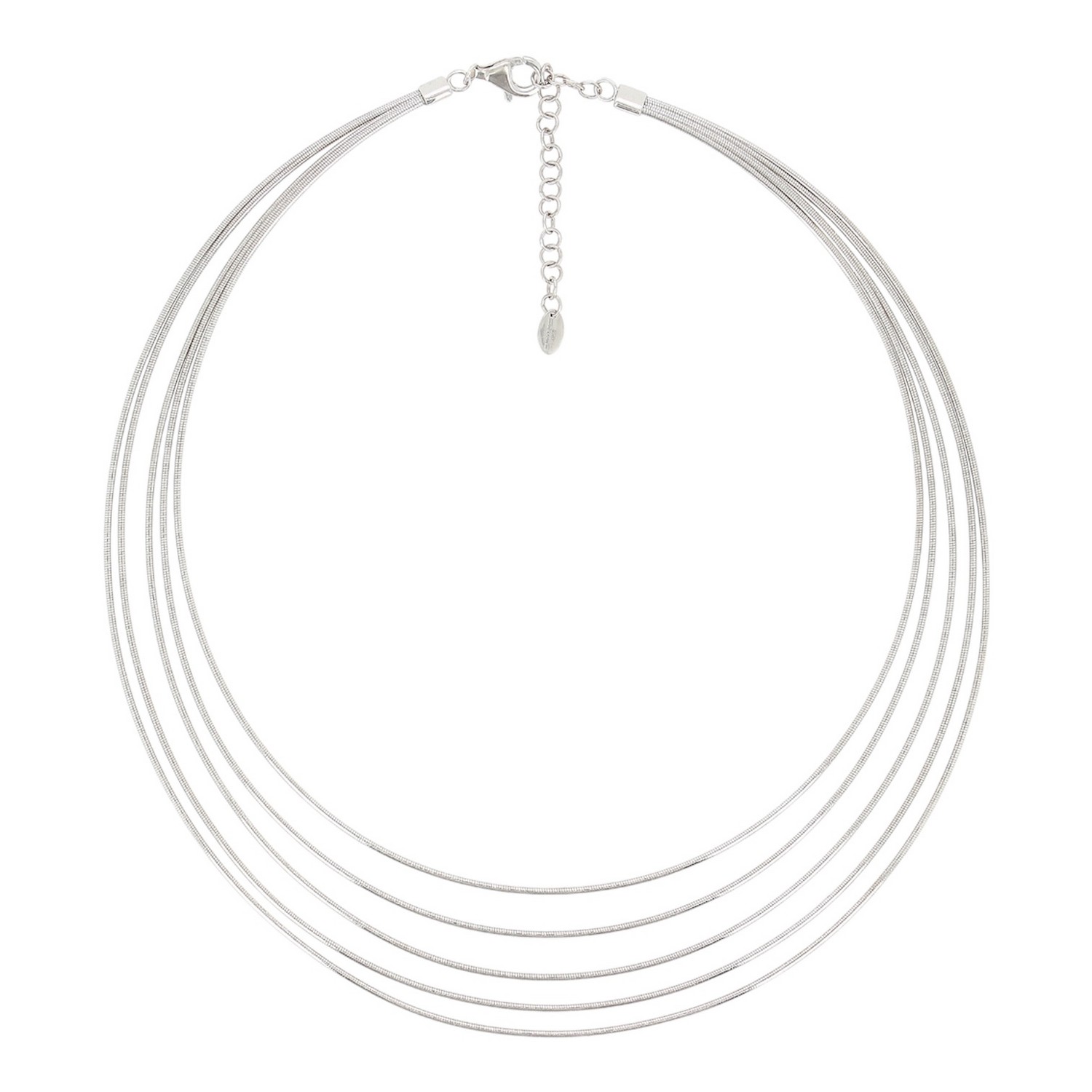Многорядное колье из инновационной коллекции DNA Spring итальянского бренда Pesavento, выполненное из серебра покрытого родием. Украшение состоит из нескольких тончайших серебряных нитей. При движении колье вибрирует и переливается, создавая яркие блики и динамичное сияние. Застежка - карабин с удлинительной цепочкой.