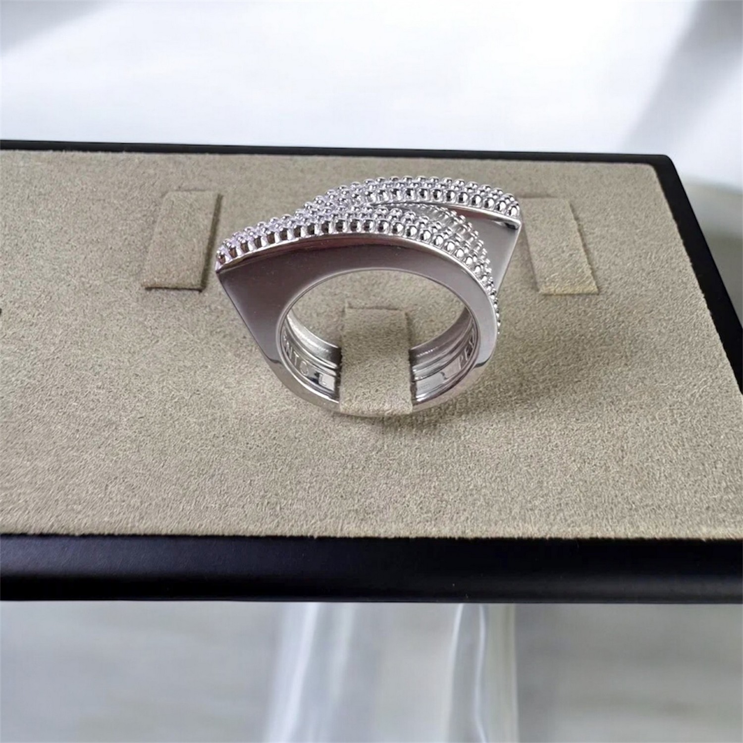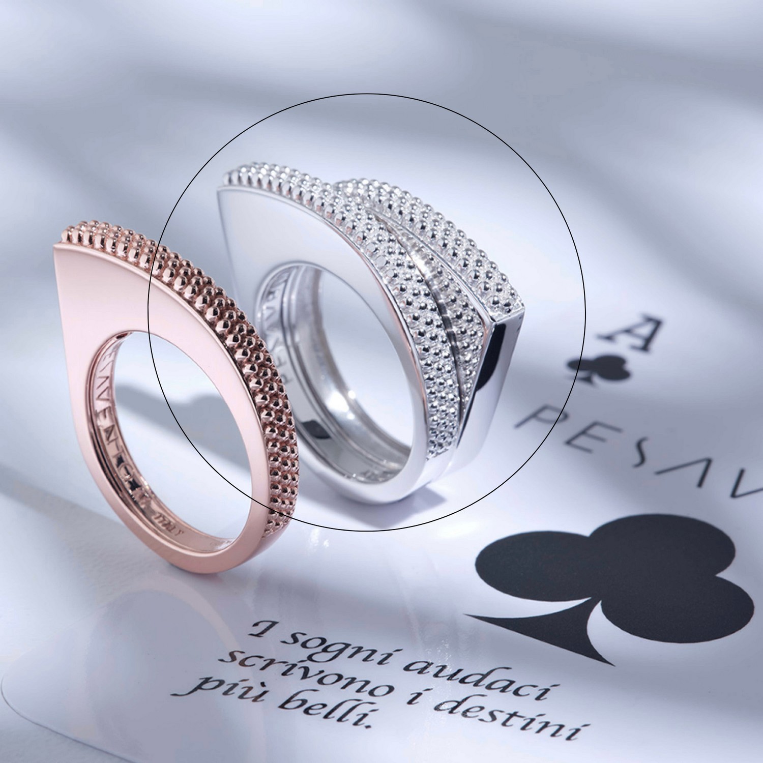 Кольцо Pesavento из коллекции Pixel в минималистичном дизайне из серебра покрытого родием. Благодаря покрытию и фирменной технике обработки серебряных микросфер, изделие обладает уникальным «бриллиантовым» блеском.