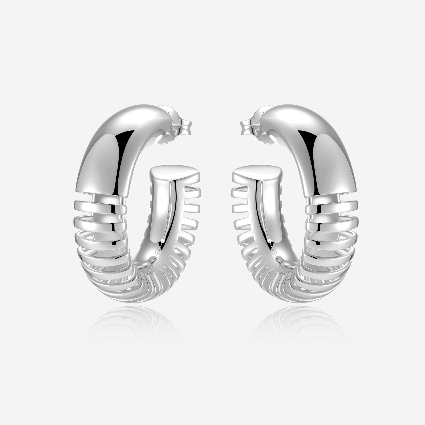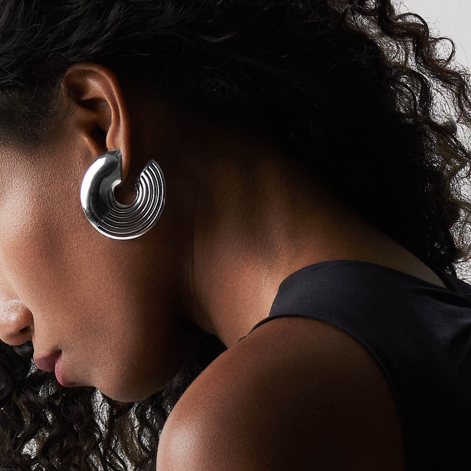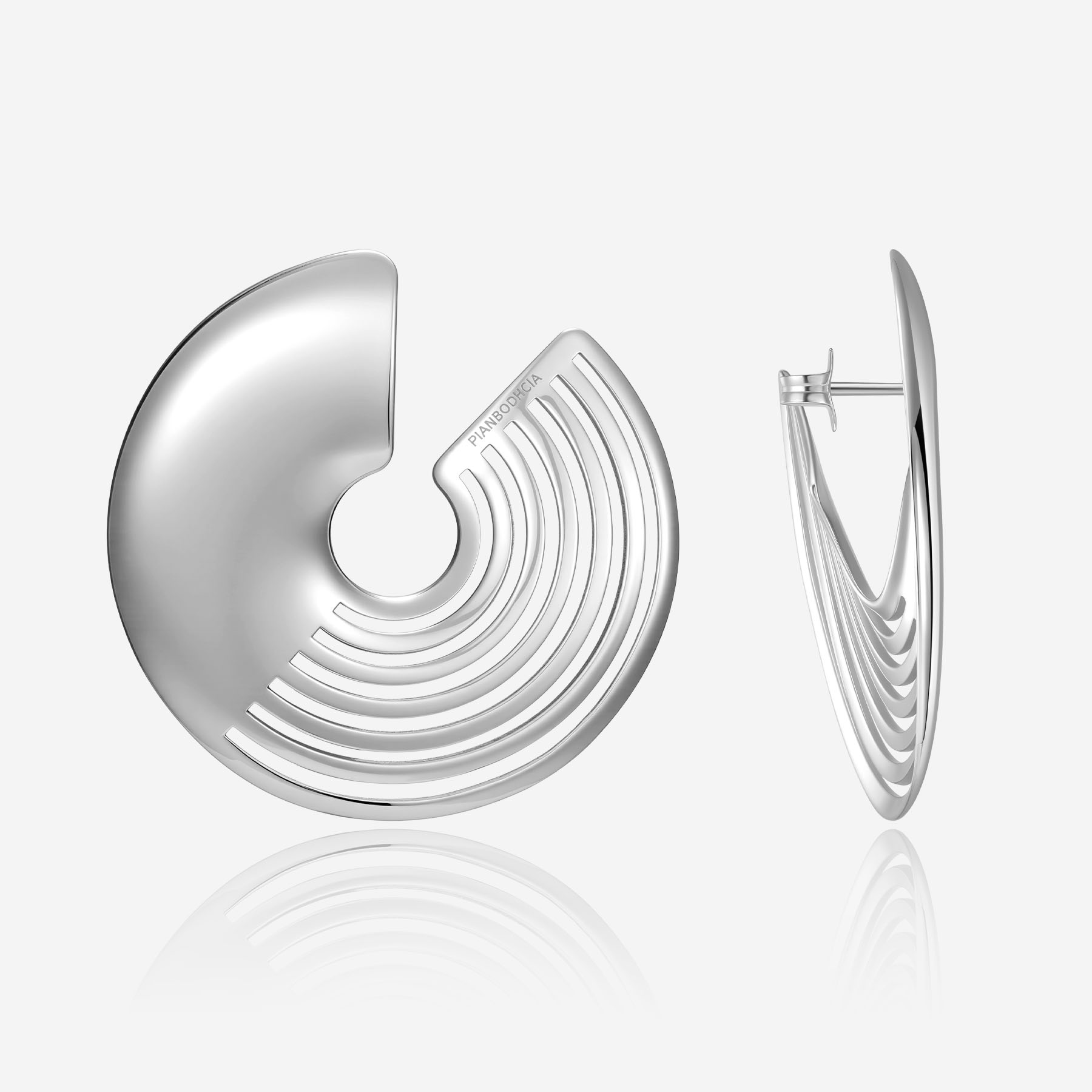 Серьги-гвоздики из коллекции Dorifora с полукольцами выполнены серебра 925-й пробы с сегментированным ажурным узором и эффектом «пустоты». Размер 50 мм. Коллекция Dorifora — это игра материала и пустоты, где форма плавно переходит в прозрачность, придавая изделию легкость и утонченность. Металл играет со светом, создавая тени и блики, которые придают украшениям особую изысканную эстетику. Вдохновением для коллекции послужили архитектурный дизайн и симметричная чистота.