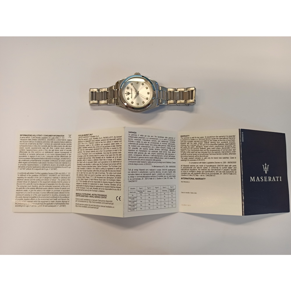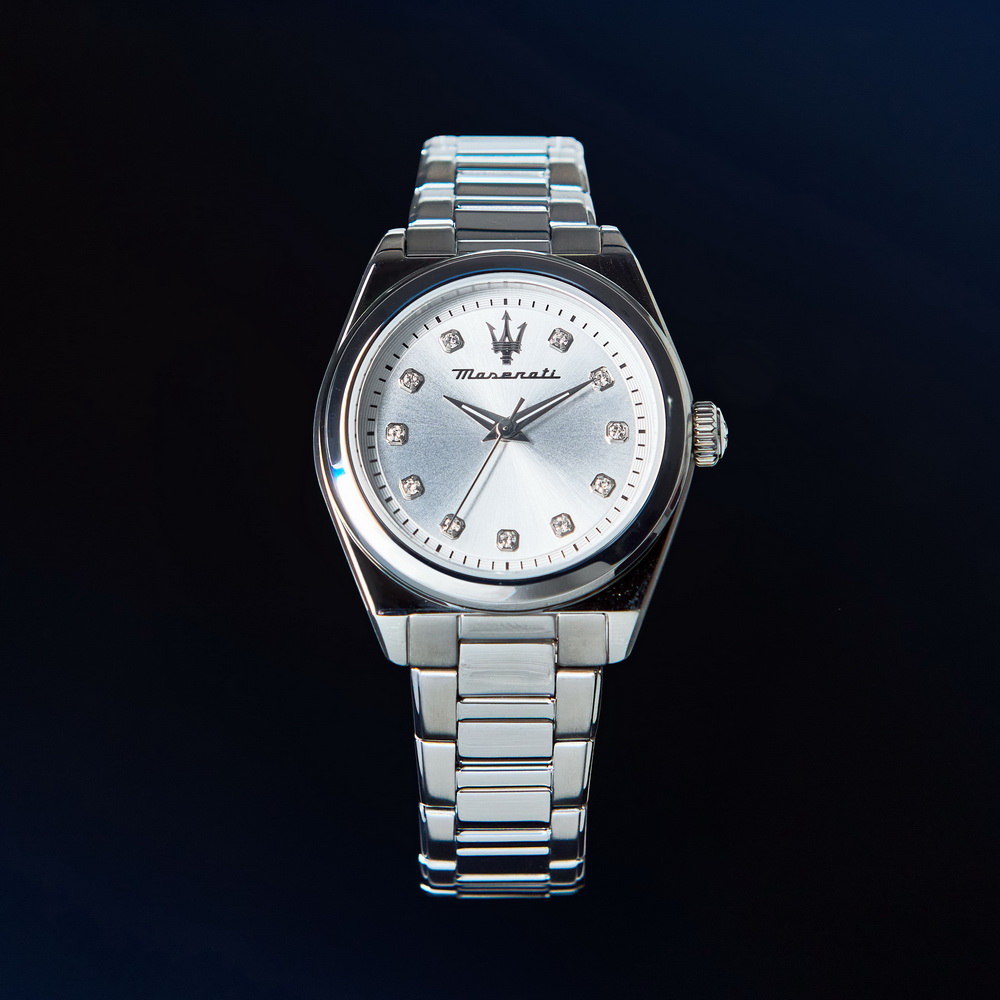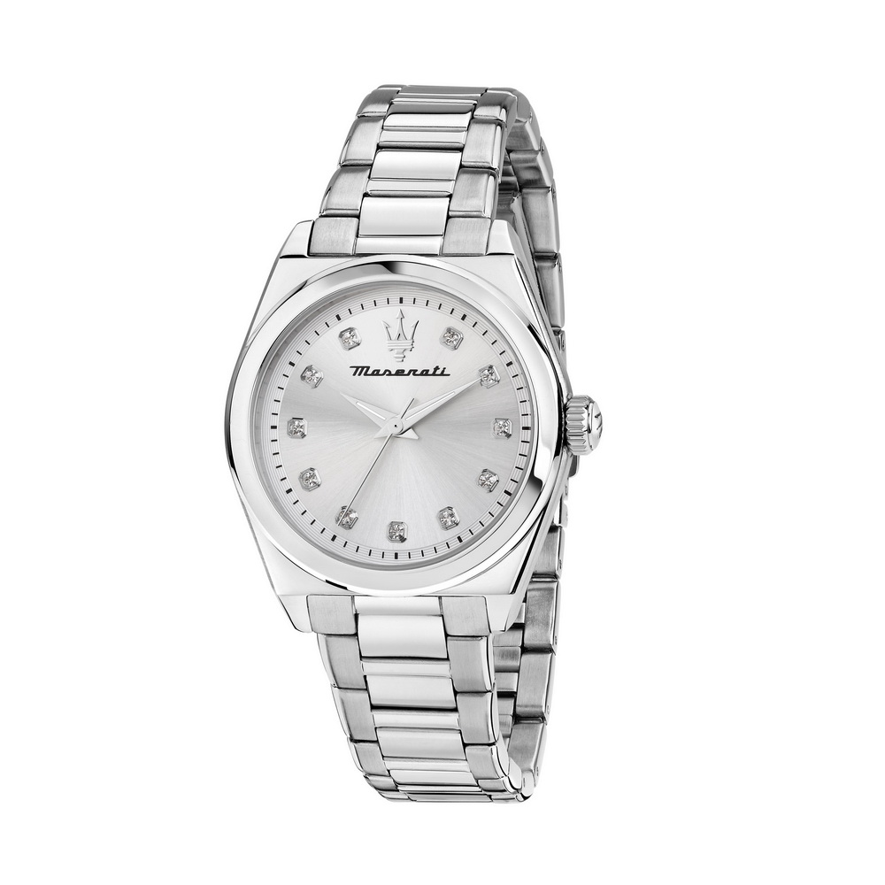 Часы наручные Женские Maserati R8853152503, Материал корпуса: Сталь, Цвет: Стальной, Вставки: Стразы из стекла, Тип механизма: Кварцевый, Стекло: Минеральное, Браслет: Сталь, Стальной, Застёжка: Клипса, Цвет циферблата: Серебристый, Тип индексов: Метки, Водозащита: 5 АТМ