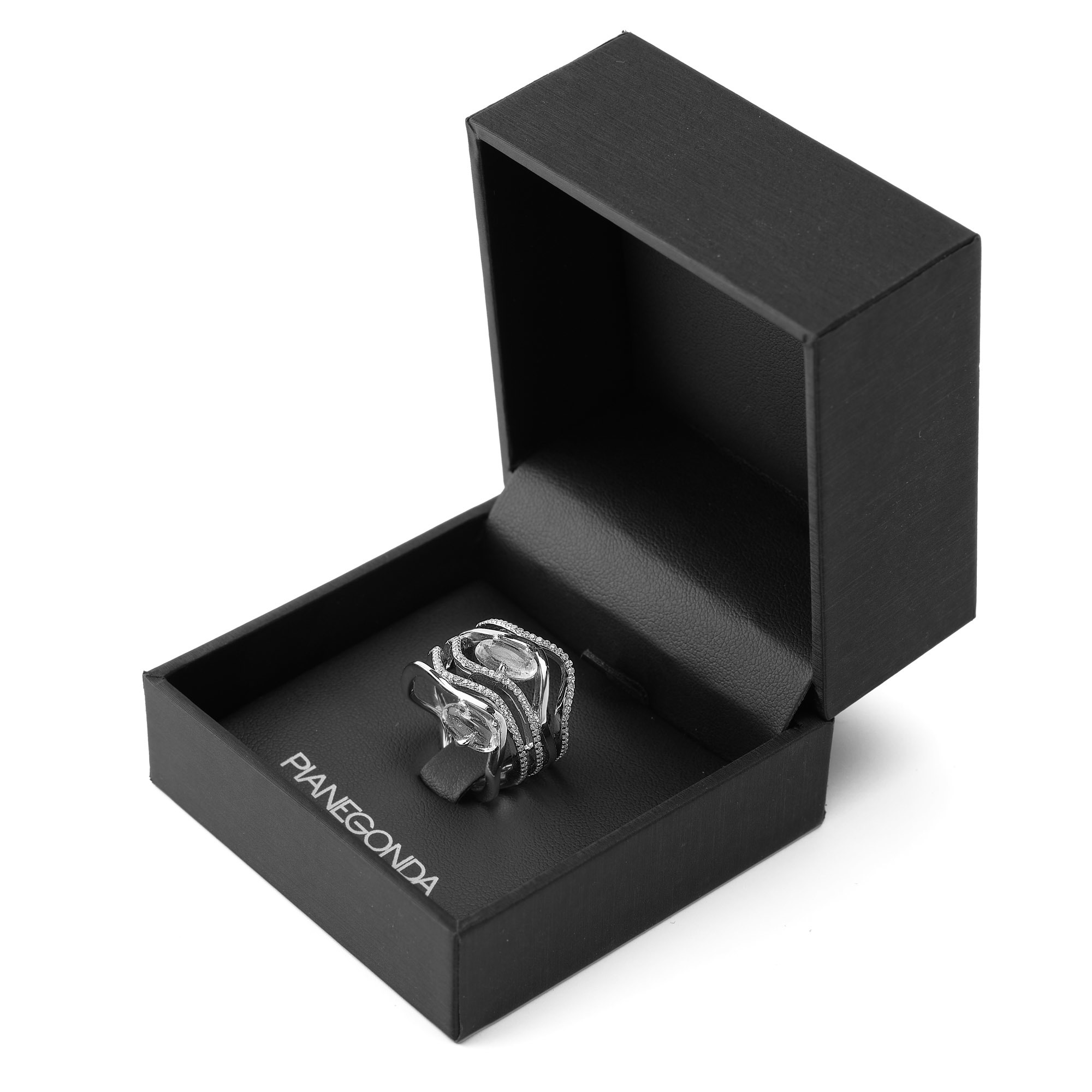 Кольцо PIANEGONDA из коллекции ANGUIS. Металл - серебро 925 пробы, горный хрусталь, 2 шт, куб. цирконий, гальваническое покрытие родием, средний вес серебра в изделии - 12 гр. Плавные изгибы напоминают очертания волн. Игра оттенков навевает ассоциации с сокровищами, хранящимися в морских пучинах