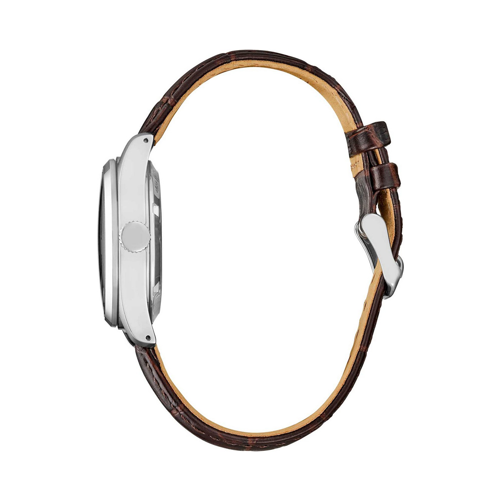 Зелёный sunray-циферблат с арабскими индексами на коричневом кожаном ремешке в корпусе 36,4 мм — утончённый полевой стиль с винтажным характером. Компактный размер легко прячется под манжетой и подходит мужчинам, ценящим классические пропорции.