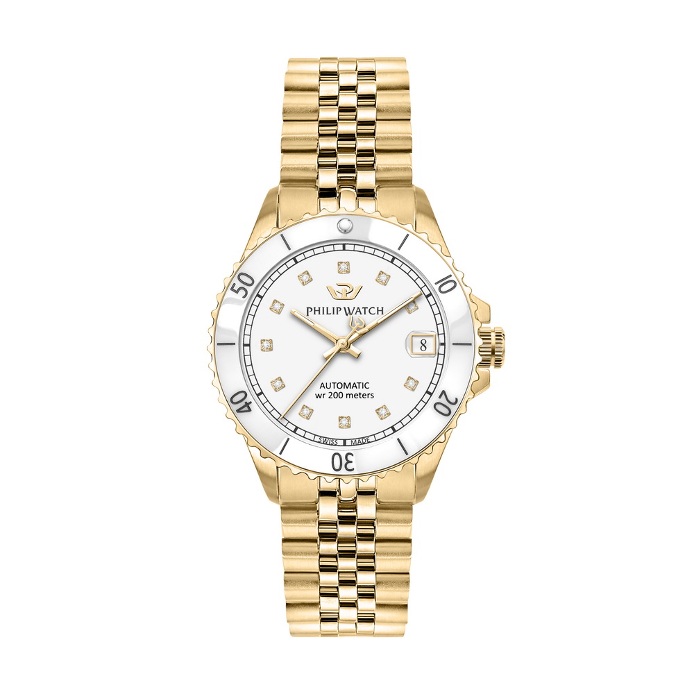 Женские механические часы Philip Watch Caribe Diving R8223216504 с автоподзаводом. Стальной корпус 35 мм с PVD-покрытием золотого цвета, серебристый циферблат с метками, сапфировое стекло. Золотистый браслет на застежке-клипсе. Водозащита 200 метров (20 АТМ) для дайвинга. Швейцарский механизм, гарантия 2 года.