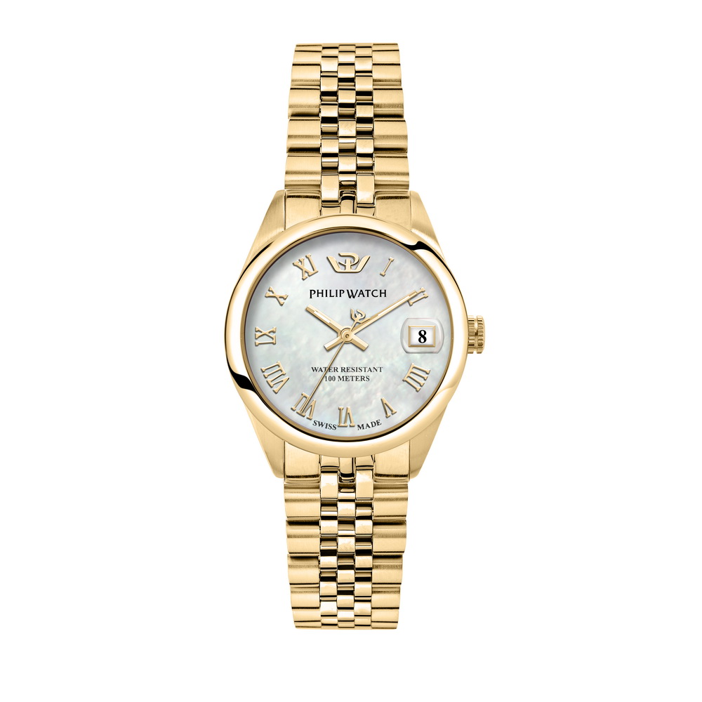 Женские кварцевые часы Philip Watch Caribe R8253597621. Стальной корпус 31 мм с PVD-покрытием золотого цвета, серебристый перламутровый циферблат с римскими цифрами, сапфировое стекло. Золотистый браслет на застежке-клипсе. Водозащита 100 метров (10 АТМ). Швейцарский кварцевый механизм, гарантия 2 года.