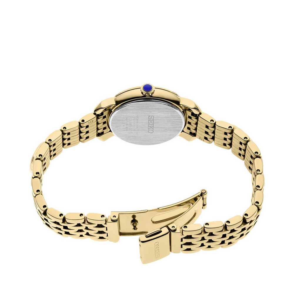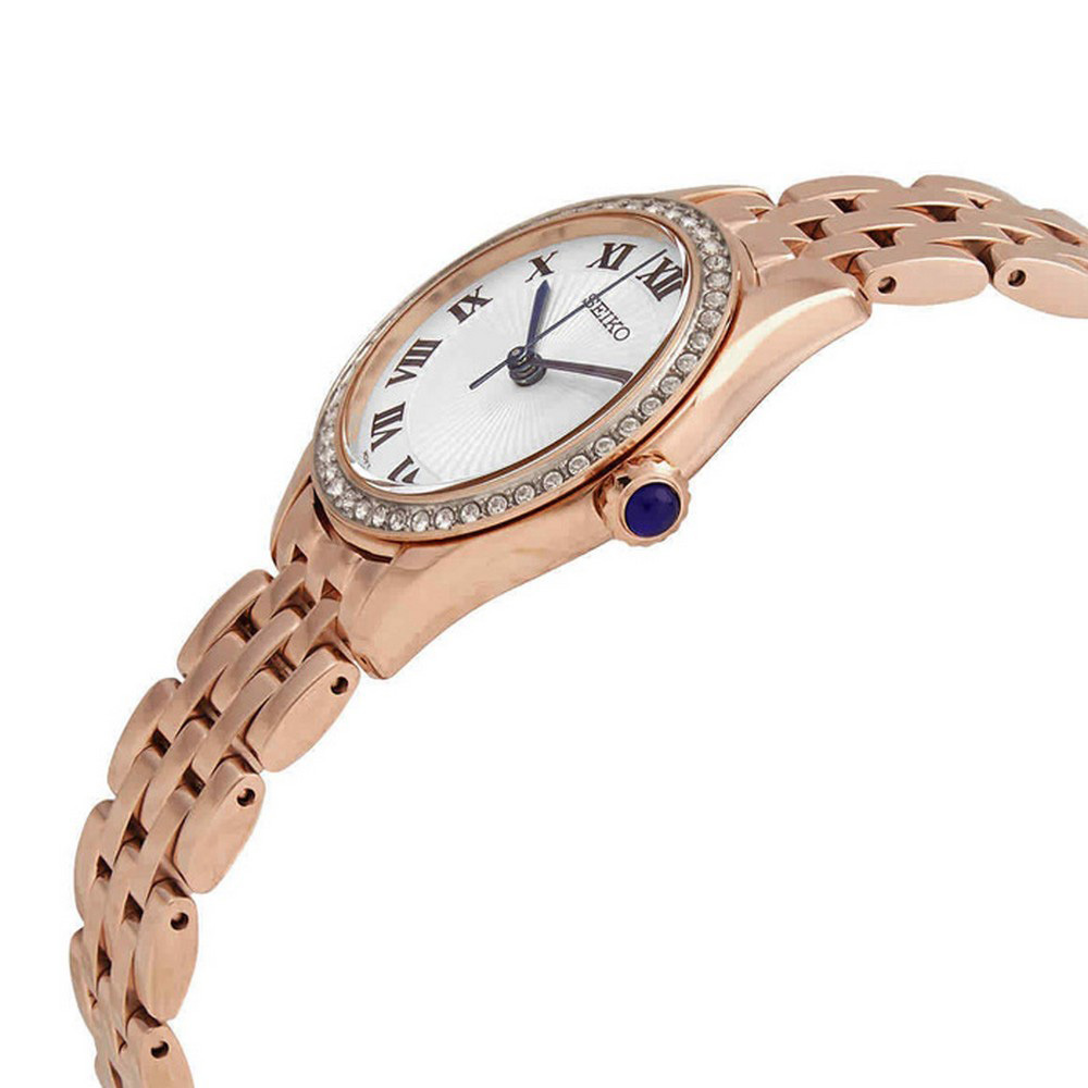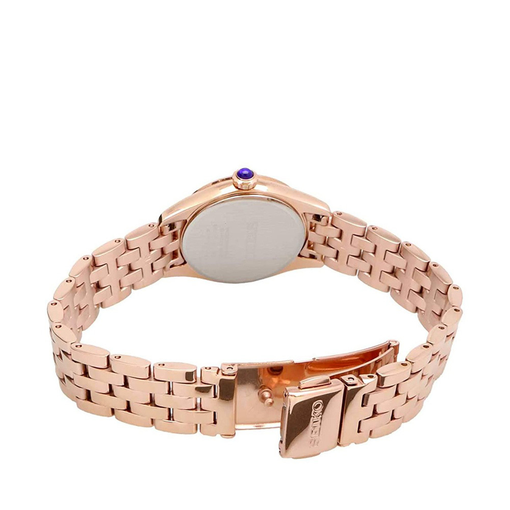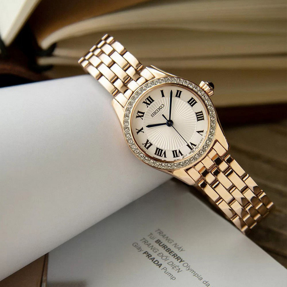 - Seiko SUR338P1 — солнечный механизм, корпус 26 мм, браслет цвета розового золота. Подходит даже на очень тонкое запястье. Идеальный подарок.