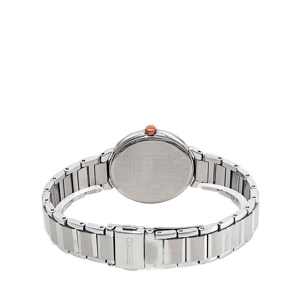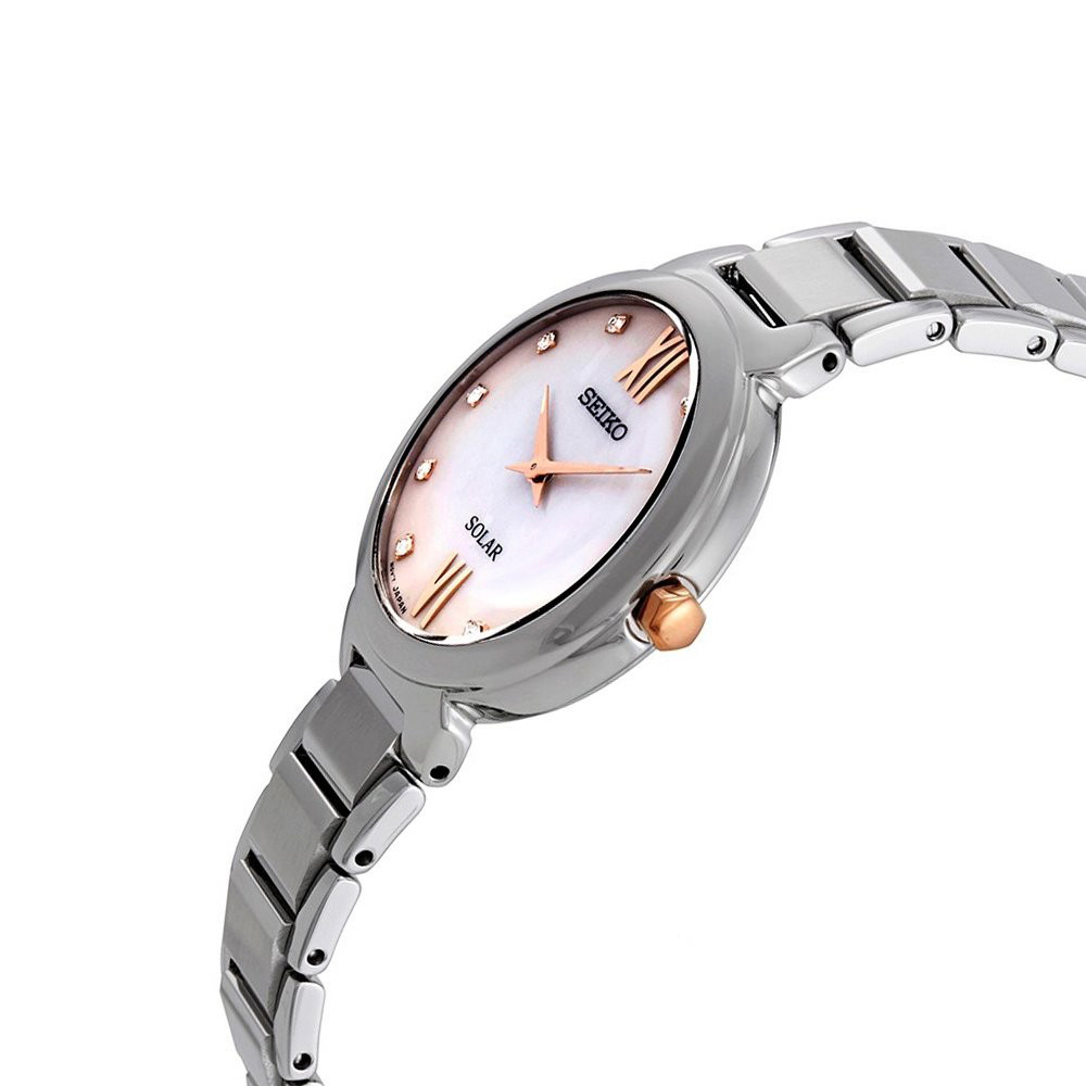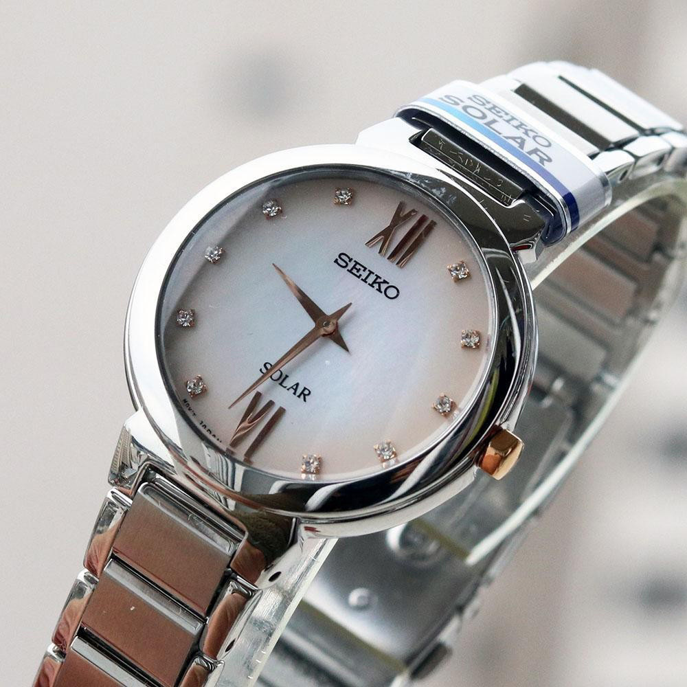 Женские часы с солнечным механизмом, не требующие замены батарейки. Перламутровый циферблат с кристаллами Swarovski, компактный корпус из нержавеющей стали 28 мм с PVD-покрытием из розового золота и стальной браслет создают элегантный образ на каждый день. Минеральное стекло защитит от царапин, а водозащита 30м не боится брызг.