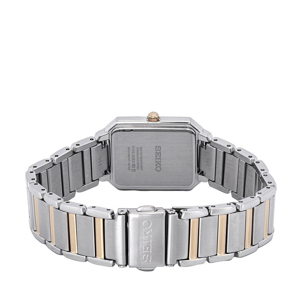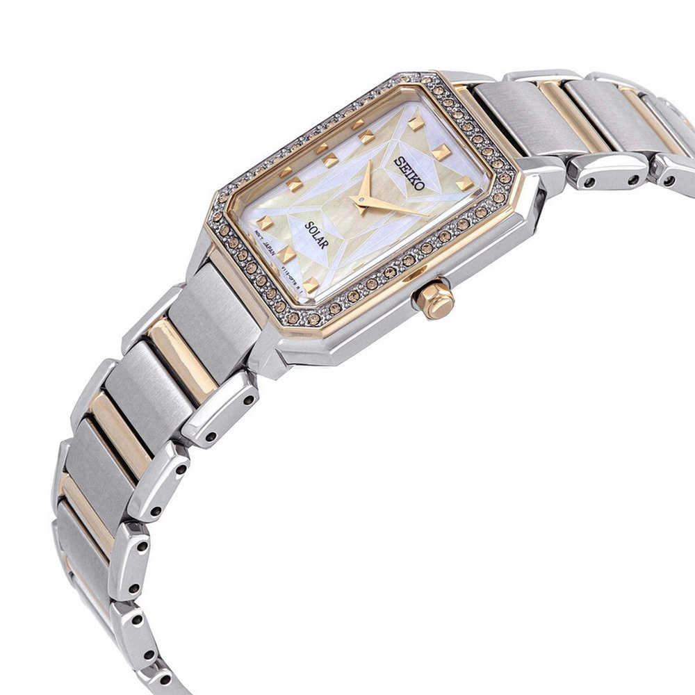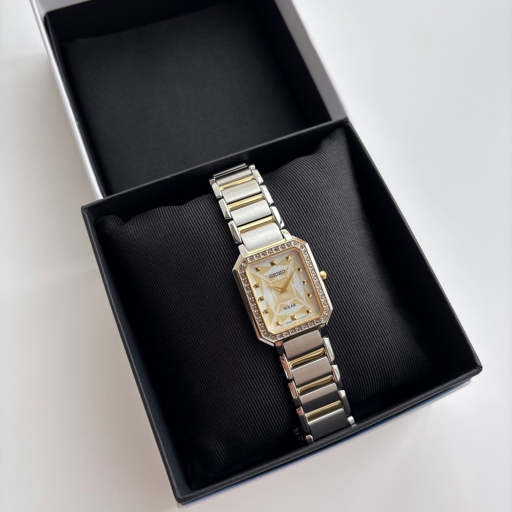 Женские часы на солнечной батарее — практичные и экологичные, без необходимости замены элементов питания. Перламутровый циферблат украшен золотистыми метками, а утончённый прямоугольный корпус 25x35 мм и браслет выполнены из нержавеющей стали с частичным PVD-покрытием. Минеральное стекло устойчиво к царапинам, а водозащита 30 м защитит от случайных капель и брызг. Элегантный и надёжный аксессуар на каждый день.