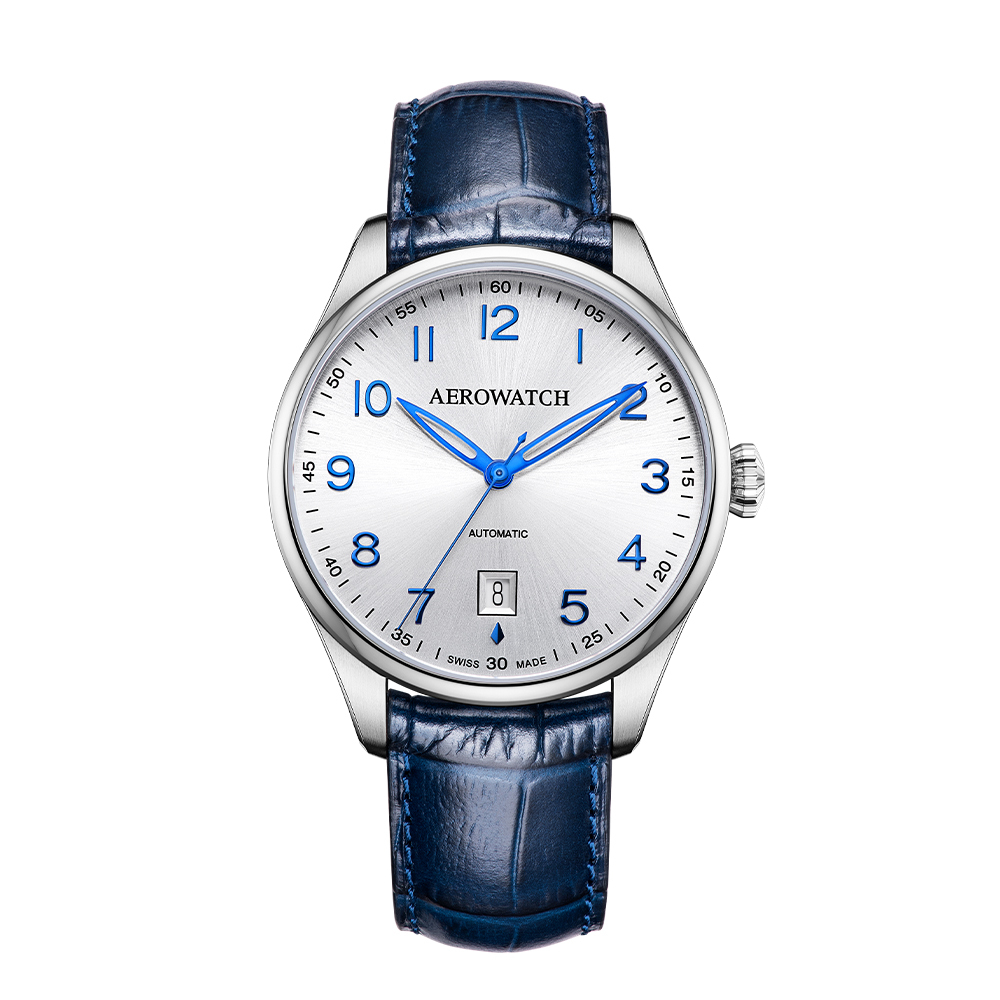 AEROWATCH 60996 AA01, швейцарские механические часы с автоподзаводом из коллекции Les Grandes Classiques. В часах установлен калибр 2824-2 ETA с 25 камнями, ротором. Стальной сатинированный корпус имеет диаметр 40 мм, прозрачную заднюю крышку и выпуклое сапфировое стекло с антибликовым покрытием. На циферблате присутствует апертура даты на 6 часах. Серебристый sunray циферблат украшен синими арабскими цифрами и скелетонизированными стрелками. У часов синий кожаный ремешок с раскладывающейся застежкой. Водозащита 5 АТМ.