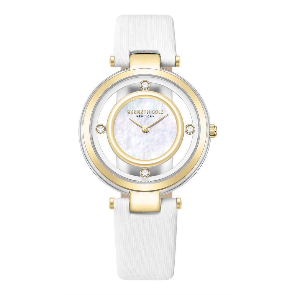 Часы наручные Женские Kenneth Cole KCWLA0027003, Размер корпуса: 34 мм, Материал корпуса: Сталь, Цвет: Золотой, Вставки: Стразы из стекла, Тип механизма: Кварцевый, Стекло: Минеральное, Ремешок: Натуральная кожа, Белый, Застёжка: Классическая пряжка, Цвет циферблата: Белый#Перламутровый, Тип индексов: Риски, Водозащита: 3 ATM
